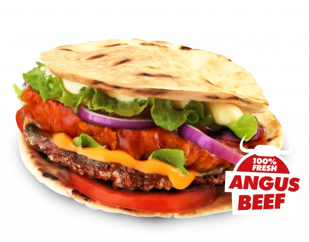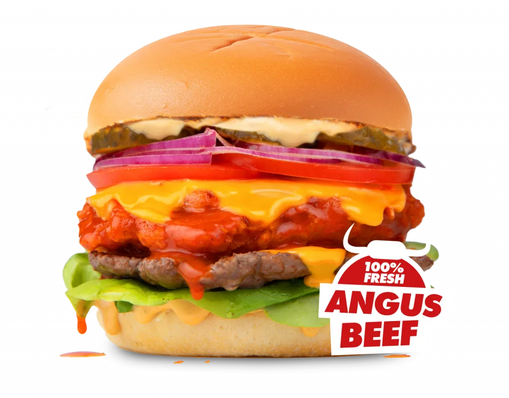 Chicken fillet, Angus Beef patty, Henny's sauce, onions, dill pickles, cheese sauce, lettuce