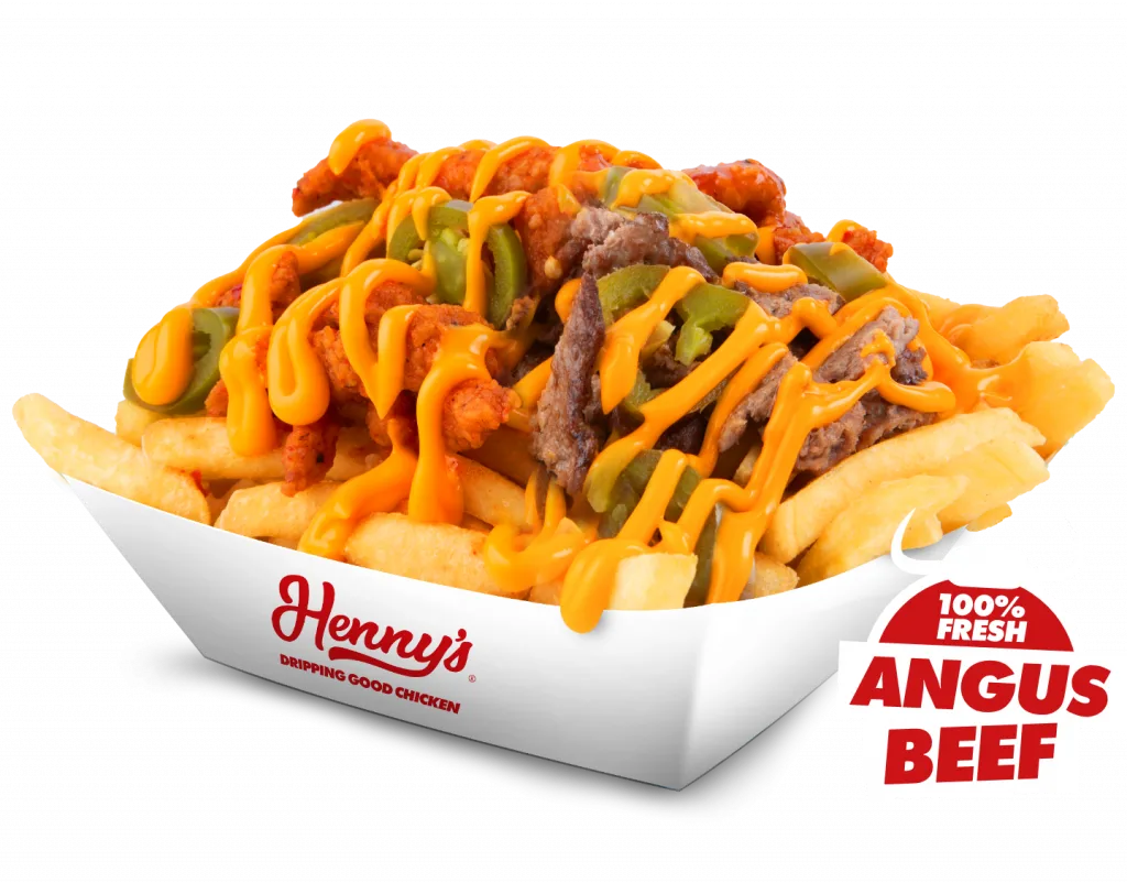 Chicken strips, Angus beef, Henny's sauce,